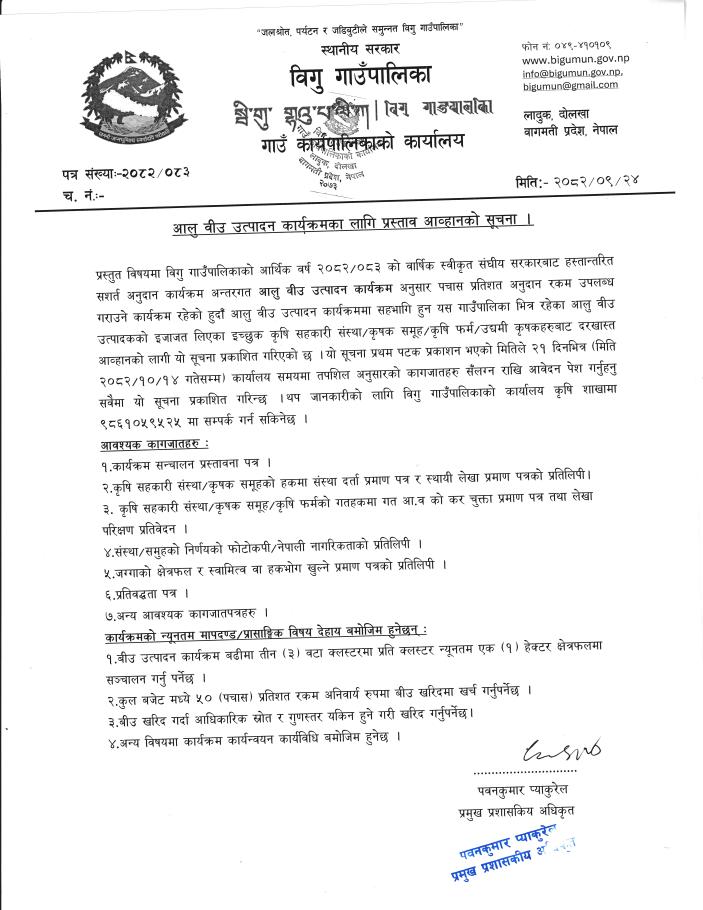 आलु वीउ उत्पादन कार्यक्रमको लागि प्रस्ताव आव्हानको सूचना ।