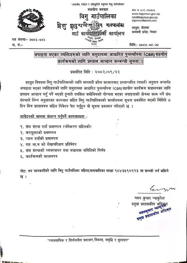 अपाङ्गता भएका व्यक्तिहरुको लागि समुदायमा आधारित पुनस्थापना (CBR) सहयोग कार्यक्रमको लागि प्रस्थाव आव्हान सम्बन्धी सूचना ।
