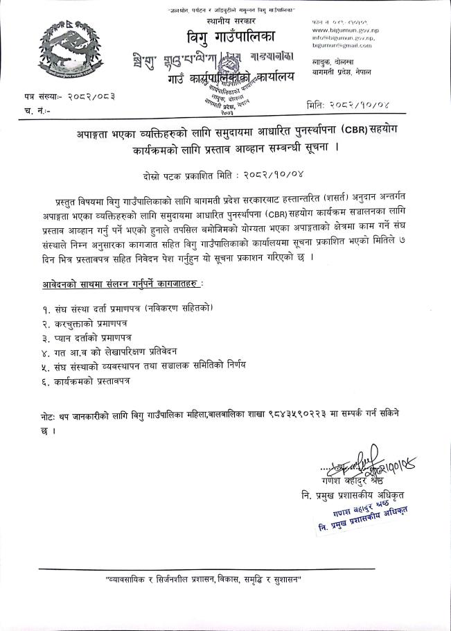 अपाङ्गता भएको व्यक्तिहरुको लागि समुदायमा आधारित पुनस्थापना (CBR) सहयोग कार्यक्रमको लागि प्रस्ताव आव्हान सम्बन्धी सूचना