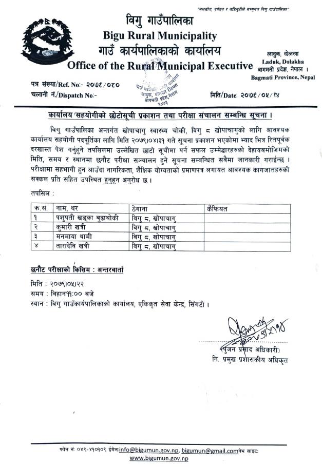 कार्यालय सहयोगी पदको छोटोसूची प्रकाशन तथा परीक्षा संचालन सम्बन्धि सूचना।