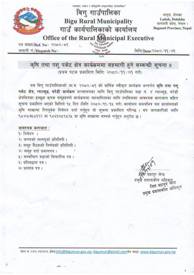 कृषि तथा पशु पकेट क्षेत्र कार्यक्रममा सहभागि हुने सम्बन्धि सूचना ।