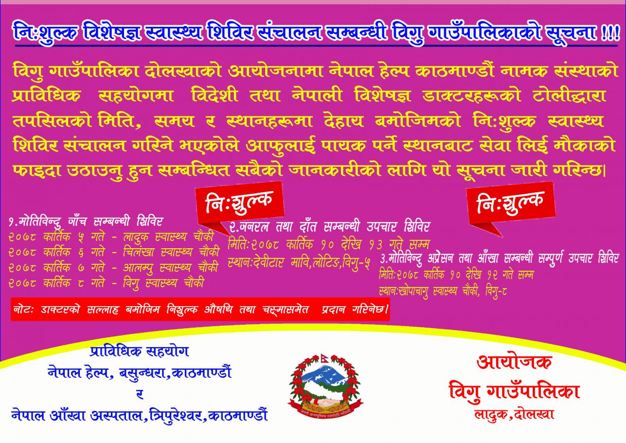निशुल्क विशेषज्ञ स्वास्थ्य शिविर संचालन सम्बन्धी विगु गाउँपालिकाकाे सूचना ।