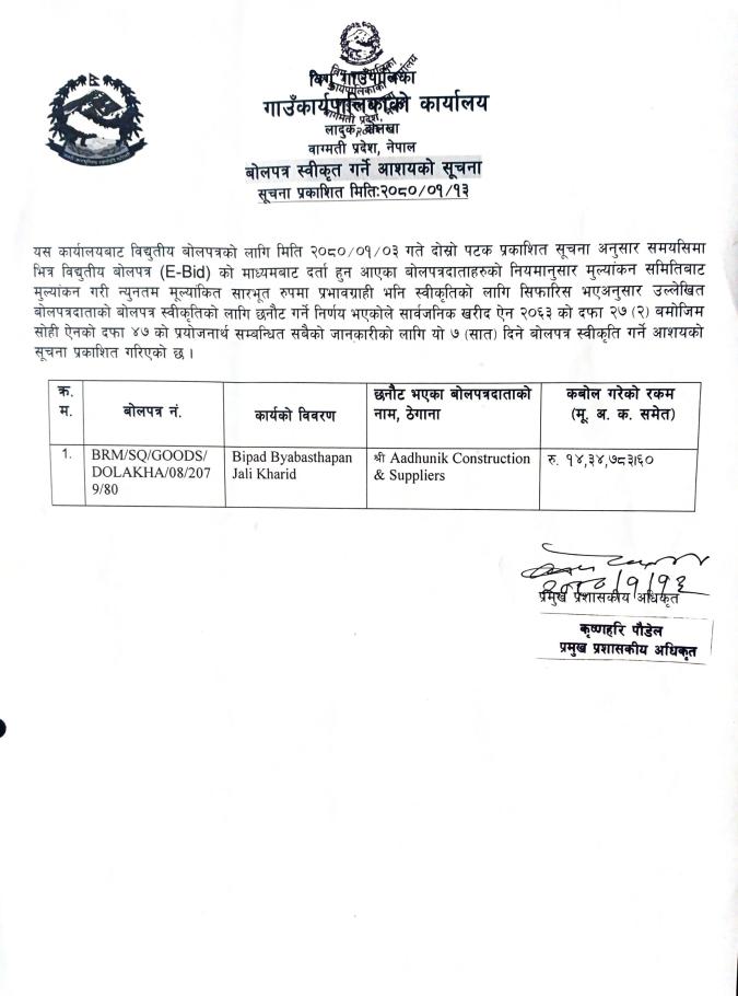 » बोलपत्र स्वीकृत गर्ने आशयको सूचना।