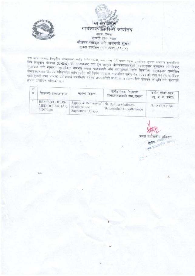 बोलपत्र स्वीकृत गर्ने आशयको सूचना। (BRM/SQ/GOODS-MED/DOLAKHA/03/2079/80)