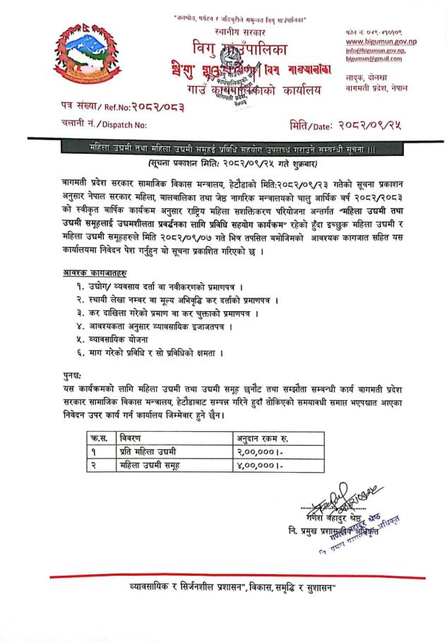 » महिला उद्यमी तथा महिला उद्यमी समुहलाई प्रविधि सहयोग उपलब्ध गराउने सम्बन्धी सूचना