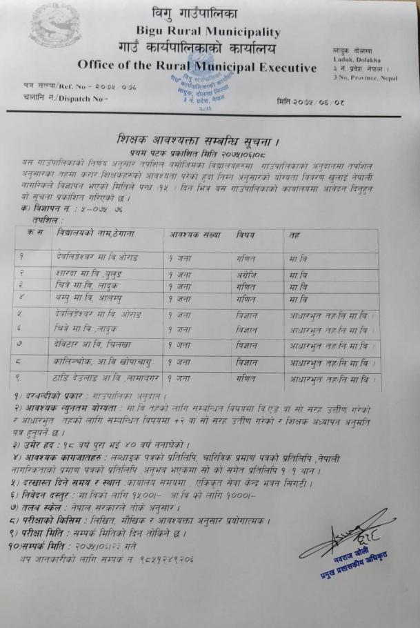 मा.वि., नि.मा.वि. र प्रा.वि तहकाे शिक्षक अावश्यकता सम्बन्धी सूचना !!!
