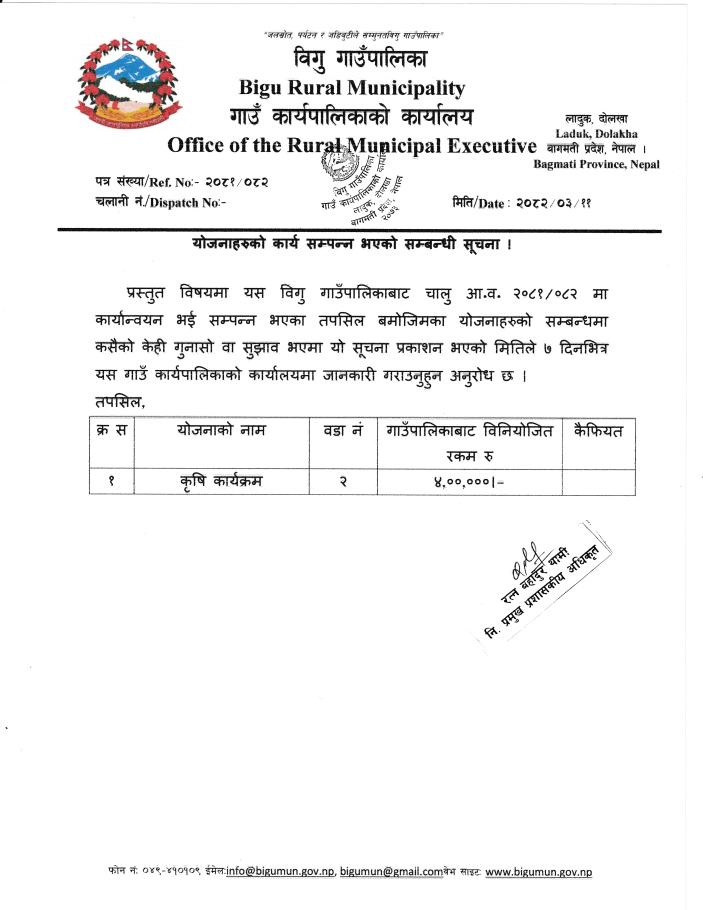 योजानाहरुको कार्य सम्पन्न भएको सम्बन्धी सूचना