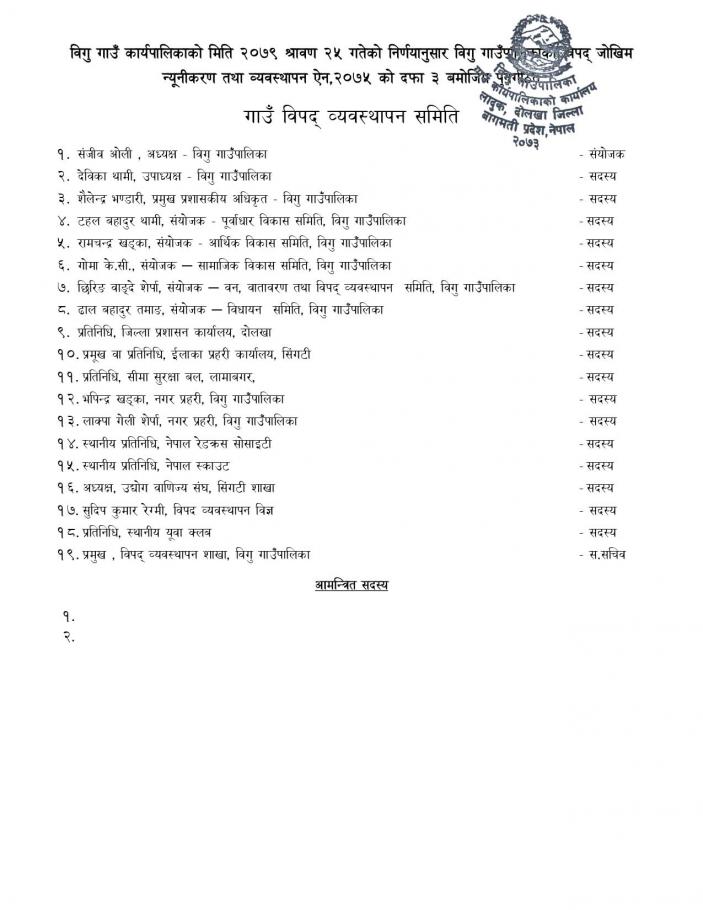 विगु गाउँ कार्यपालिकाको मिति २०७९ श्रावण २५ गतेको निर्णयानुसार विगु गाउँपालिकाको विपद् जोखिम न्यूनीकरण तथा व्यवस्थापन ऐन,२०७५ को दफा ३ बमोजिम पुनर्गठित गाउँ विपद् व्यवस्थापन समिति