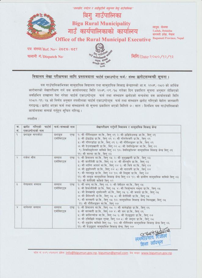 विद्यालय लेखा परिक्षणका लागि प्रस्तावदाता चार्टर्स एकाउण्टेन्ट फर्म/संस्था छनौट सम्बन्धी सूचना ।