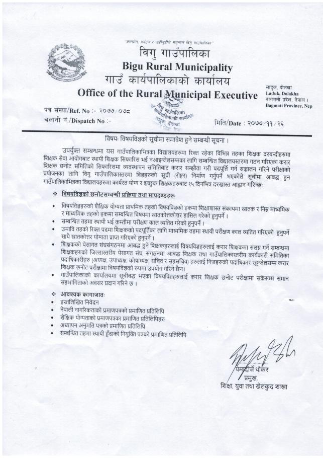 विषय विज्ञकाे सूचीमा समावेश हुने सम्बन्धमा.