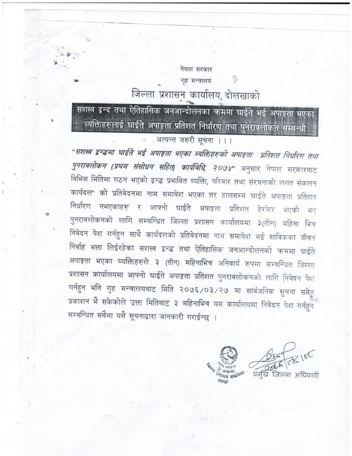 सशस्त्र द्वन्द तथा ऐतिहासिक जनआन्दोलनका क्रममा घाइते भई अपाङ्गता भएका व्यक्तिहरुलाई घाइते प्रतिशत निर्धारण तथा पुनरावलोकन सम्बन्धी अत्यन्त जरुरी सूचना