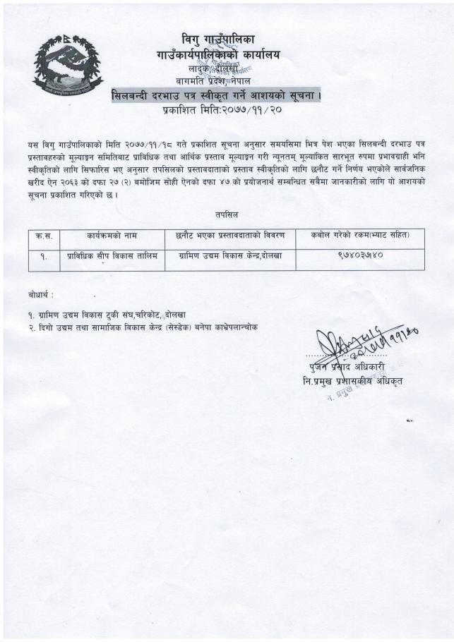 सिलबन्दी दरभाउ पत्र स्वीकृत गर्ने आशयकाे सूचना ।