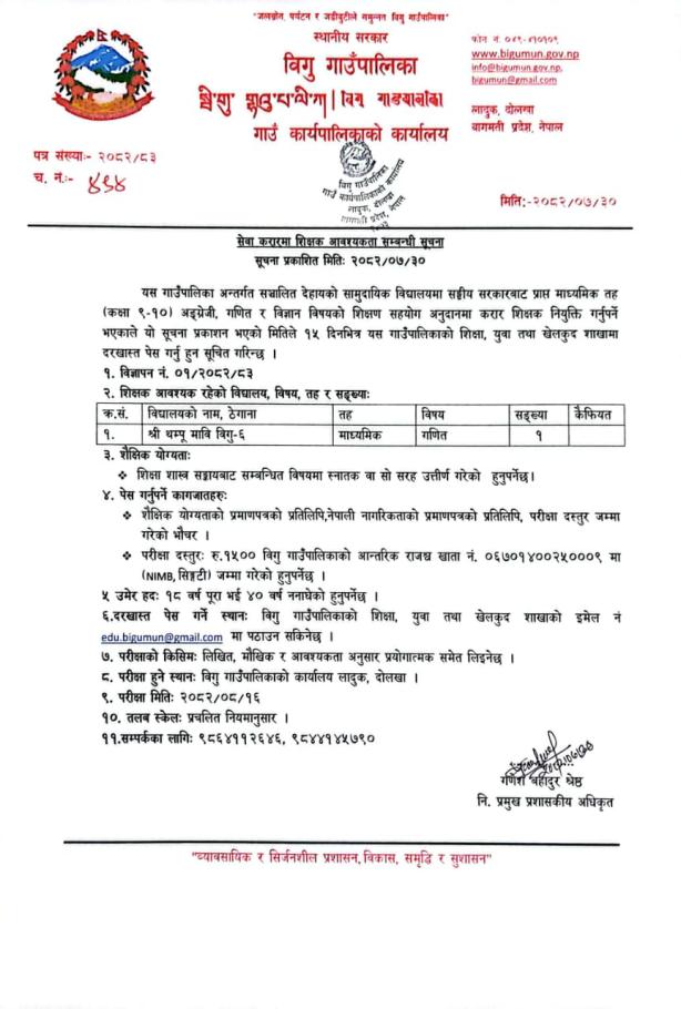 सेवा करारमा शिक्षक आवश्यकता सम्बन्धि सूचना