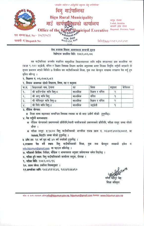 सेवा करारमा शिक्षक आवश्यकता सम्बन्धी सूचना